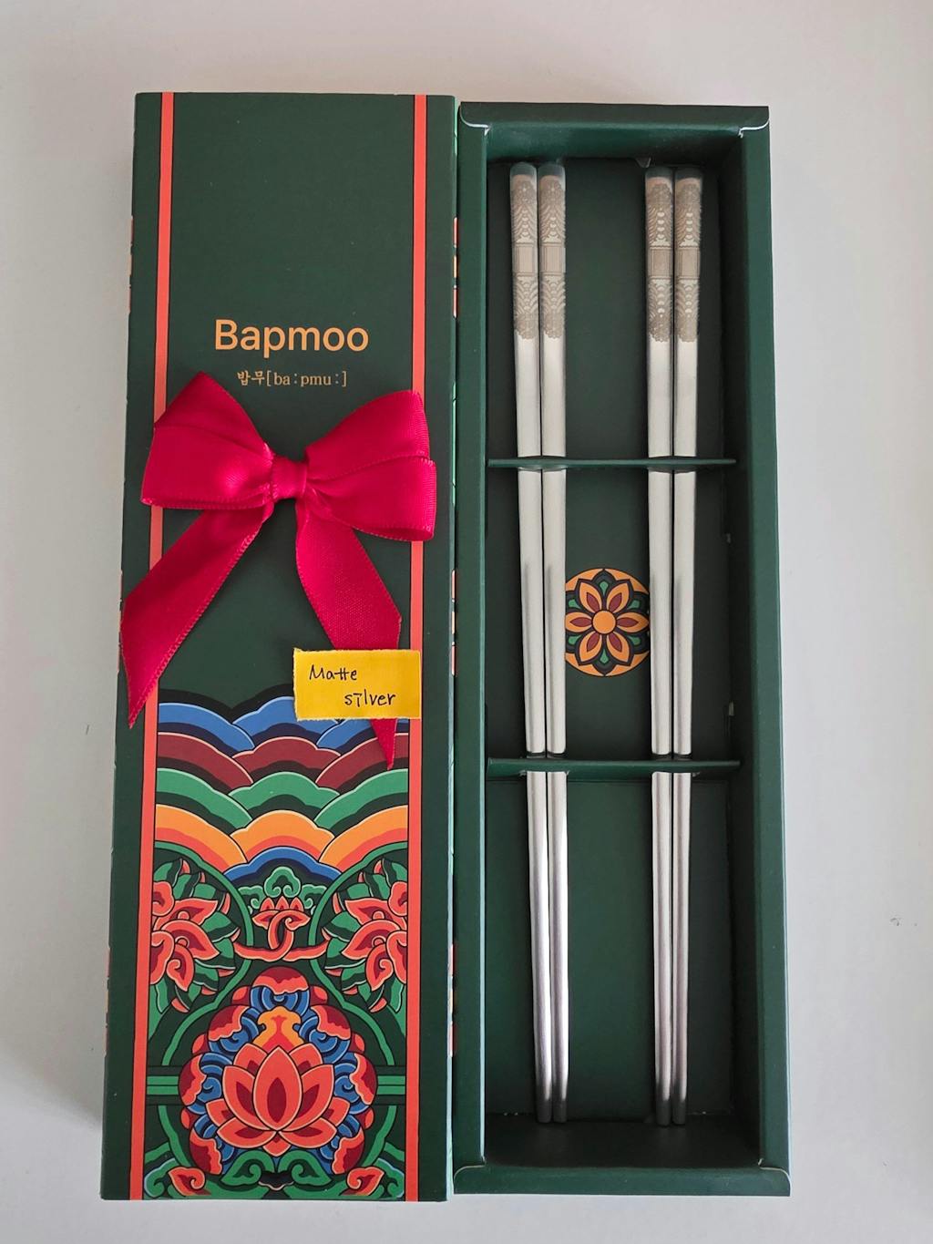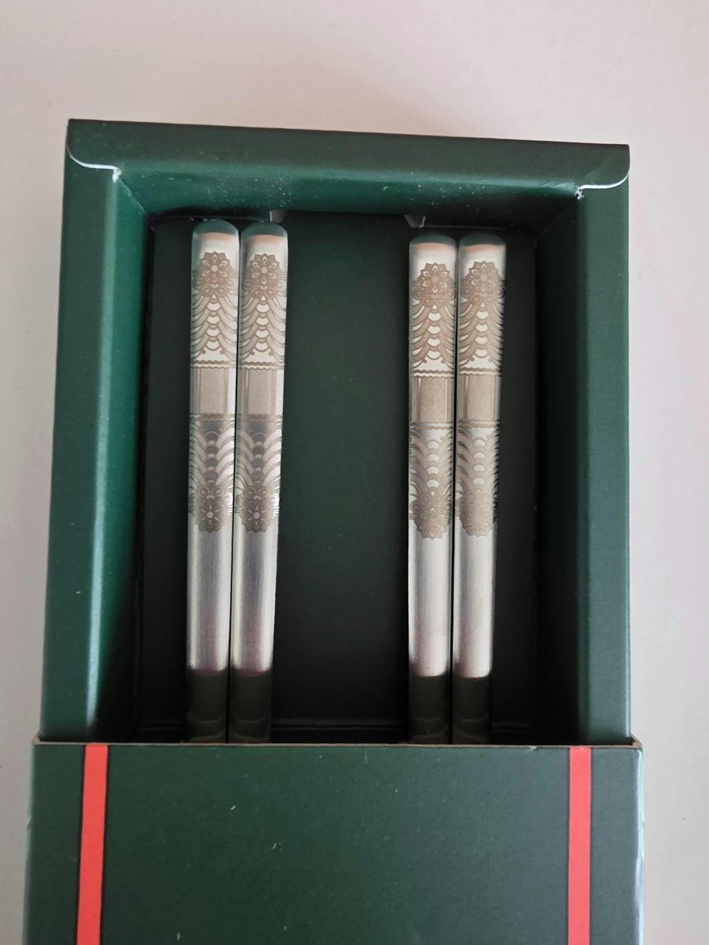 The matte silver is perfect, the packaging looks super premium! It's so nice, the chopsticks sit really well with my existing sets but the engraving makes it more special, for my best dinners or when I have guests!